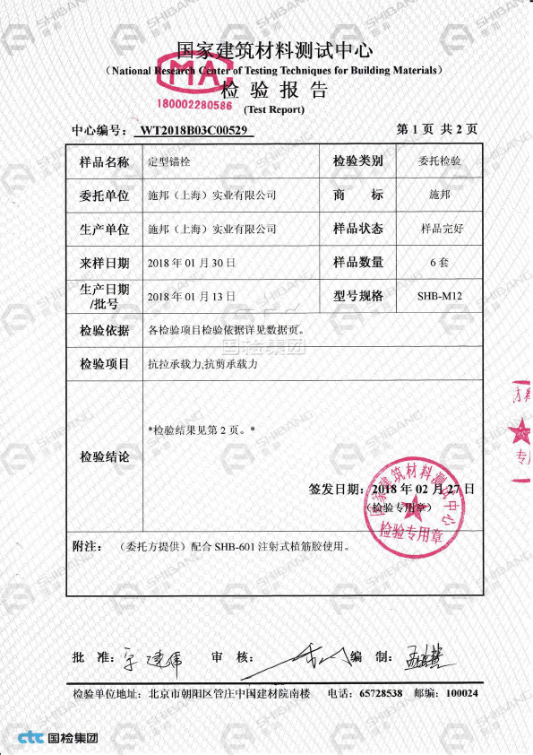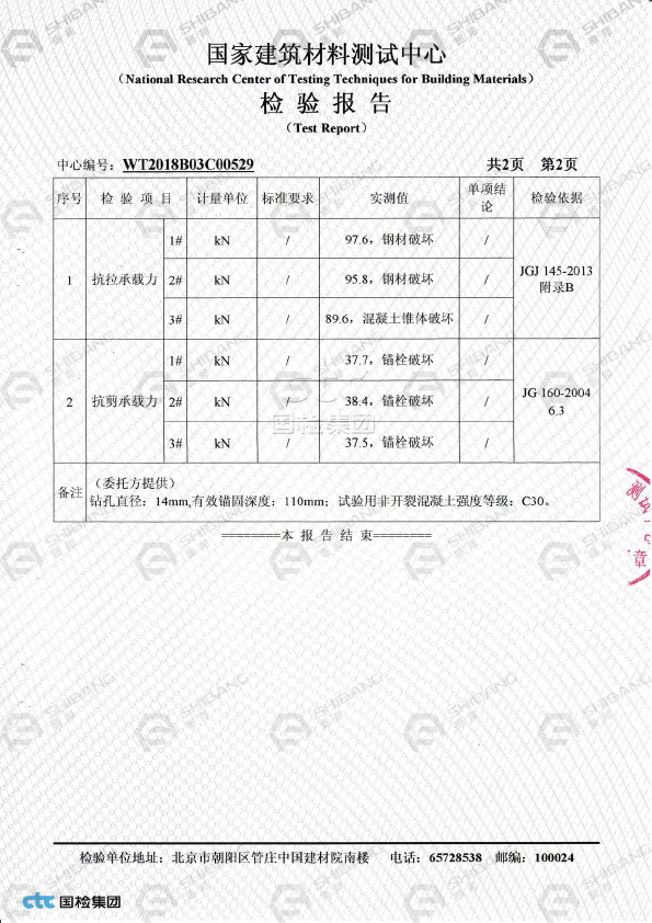 • SHB 特殊倒锥定型锚栓抗拉、抗剪检测