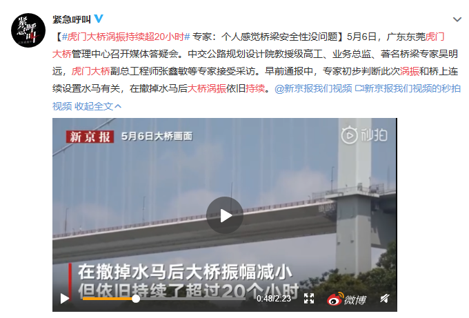 但直至小编发稿前,虎门大桥涡振已持续超20小时。5月6日,广东东莞虎门大桥管理中心召开媒体答疑会。中交公路规划设计院教授级高工、业务总监、著名桥梁专家吴明远,虎门大桥副总工程师张鑫敏等专家接受采访,专家预估:个人感觉桥梁安全性没问题。而在早前通报中,专家初步判断此次涡振和桥上连续设置水马有关,在撤掉水马后大桥涡振依旧持续。