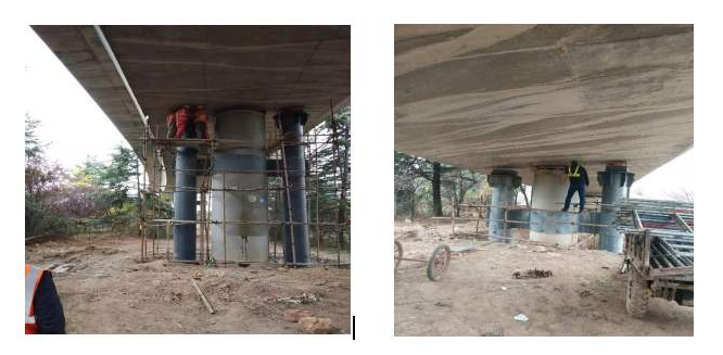 此技术一般做法是利用原独柱墩承台,在独柱墩两侧(横桥向)各增加一根圆柱墩,新增墩柱顶端安装板式橡胶支座。原独柱墩若是单柱单桩无承台的结构,则需按下部结构承载能力验算考虑增加基桩和承台,新增承台通过植筋、混凝土浇筑与原结构连成整体。