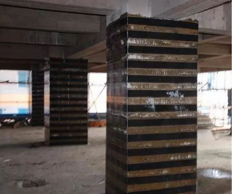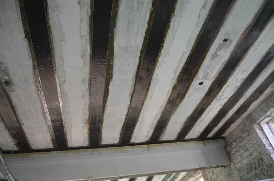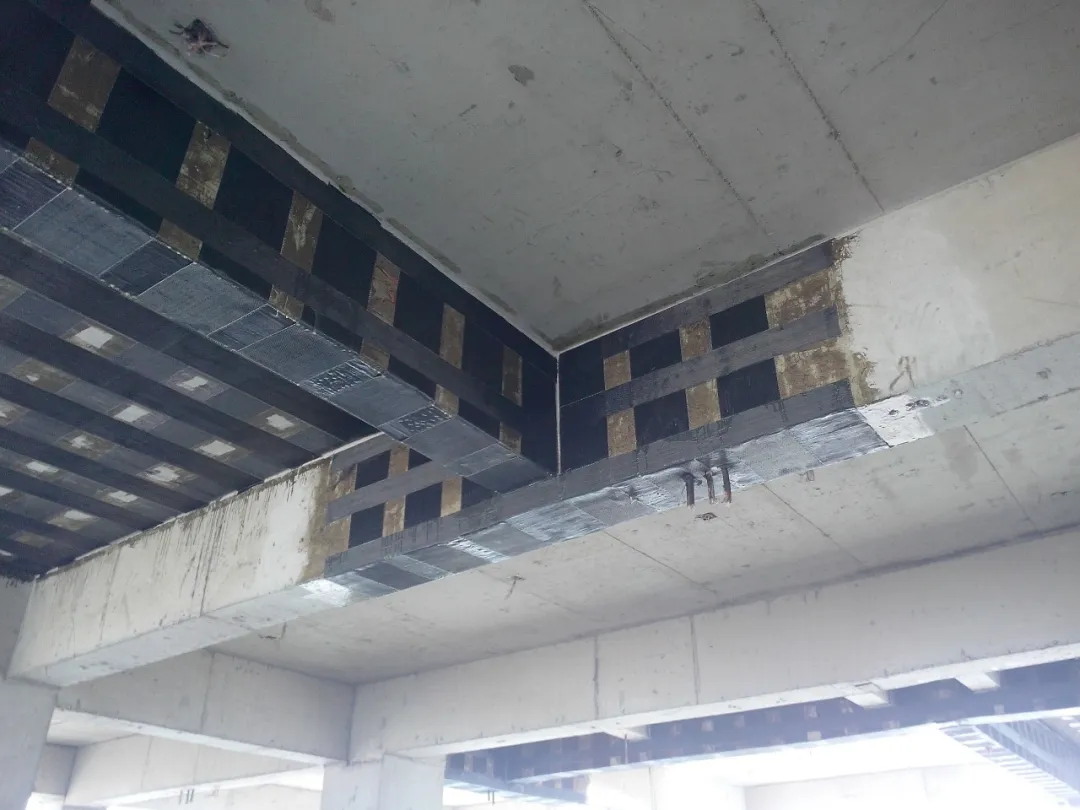当混凝土构件出现裂缝且需要对裂缝进行修复时,可先使用灌缝胶对裂缝进行修复后,再进行碳纤维布粘贴。粘合碳纤维布可以限制裂缝的发展,间接提高结构的抗裂性。